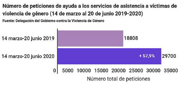 Las peticiones de ayuda a los servicios de asistencia a víctimas de violencia de género (llamadas y consultas online al 016 y servicio de Whatsapp) se elevan a un total de 29.700 durante el estado de alarma, lo que supone un aumento del 57,9% (10.892 peticiones más) respecto al año anterior. En el mismo periodo de 2019, del 14 de marzo al 20 de junio, las mujeres atendidas fueron 18.808.
