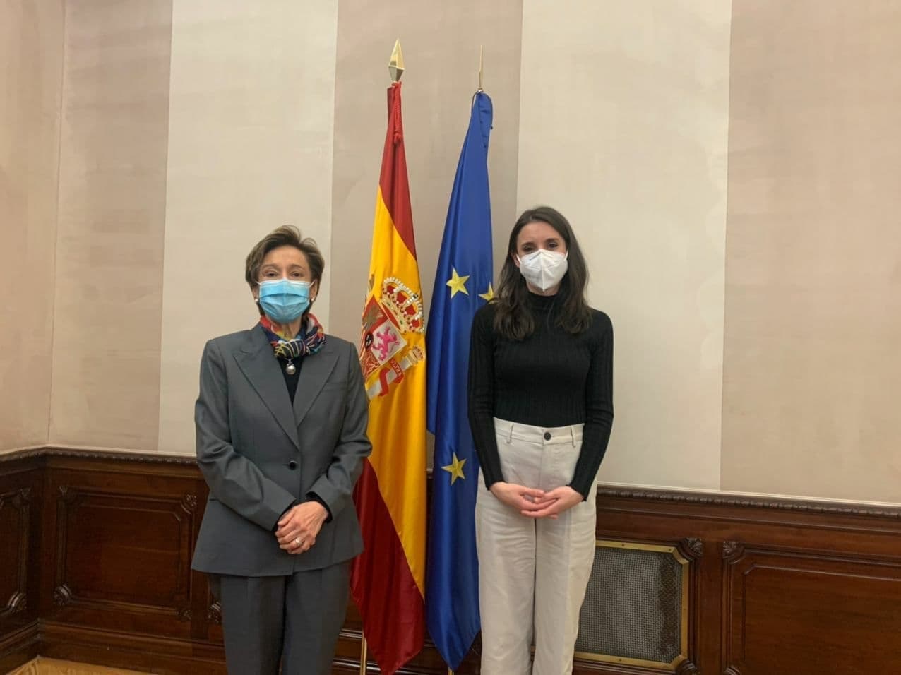 La ministra de Igualdad, Irene Montero, ha recibido esta mañana a María Carmen Oñate Muñoz, embajadora de México en España. Durante el encuentro, han intercambiado puntos de vista sobre los compromisos en materia de igualdad de género de ambos países, así como sobre la necesidad de establecer alianzas feministas internacionales para garantizar los derechos humanos de las mujeres. Así, han abordado asuntos como la promoción de la igualdad, la lucha contra los feminicidios y la violencia contra las mujeres, y el impacto específico de la Covid-19 en la vida de las mujeres y las niñas. La ministra Montero ha expresado el compromiso firme de España en la defensa de unas relaciones internacionales feministas, así como el papel central que le confiere al Foro Generación Igualdad de ONU Mujeres, coorganizado también por México y Francia.